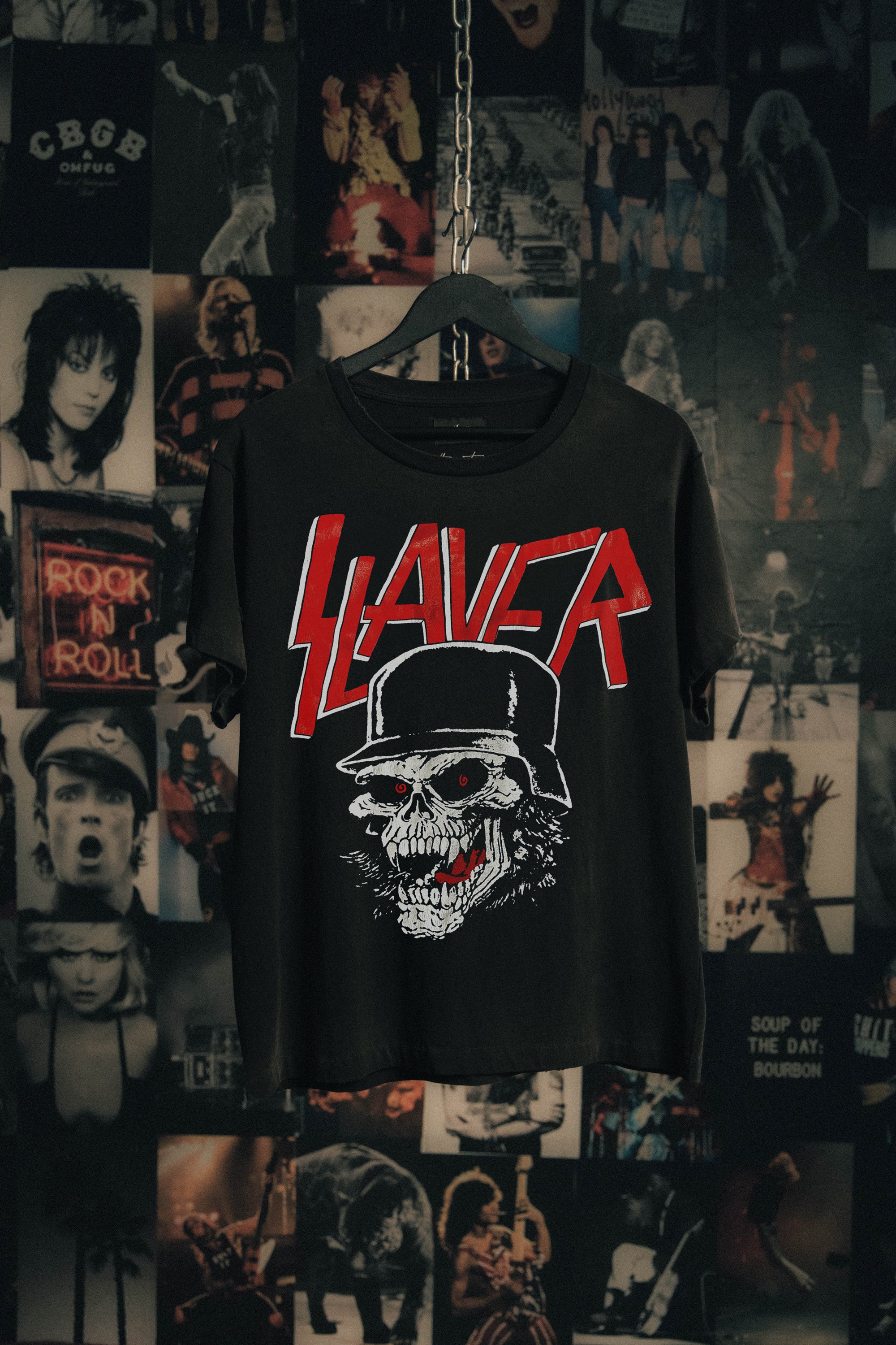 The Slayer Vintage T-Shirt channels the raw energy of 90s Slayer with its iconic graphic, hand-screen printed in the UK using vintage-correct plastisol inks on Front & back. Featuring single stitch hems, signature stitch construction, and a classic ribbed neck, this relaxed-fit tee is crafted from 180gsm washed black cotton. Hand-aged and distressed for a perfectly worn-in look and feel.