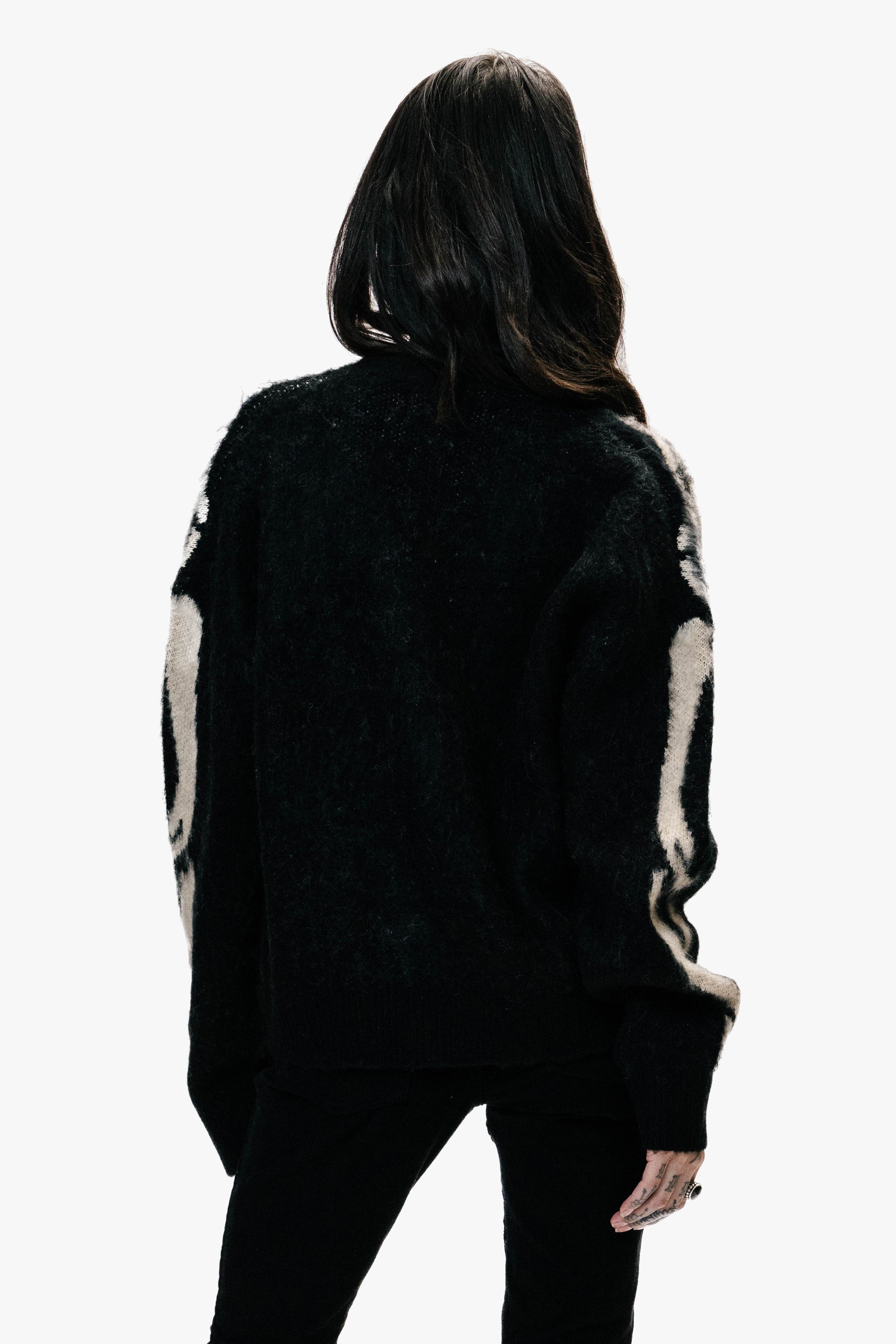 Crafted from a premium brushed wool and mohair blend, this oversized cardigan delivers a soft, luxurious feel with a rebellious edge. The bold skeleton graphic channels classic rock energy, while the ribbed placket, cuffs, and hem bring structure to its relaxed silhouette. Finished with front pockets for attitude and ease, a statement piece built for late nights, loud rooms, and life on the edge.