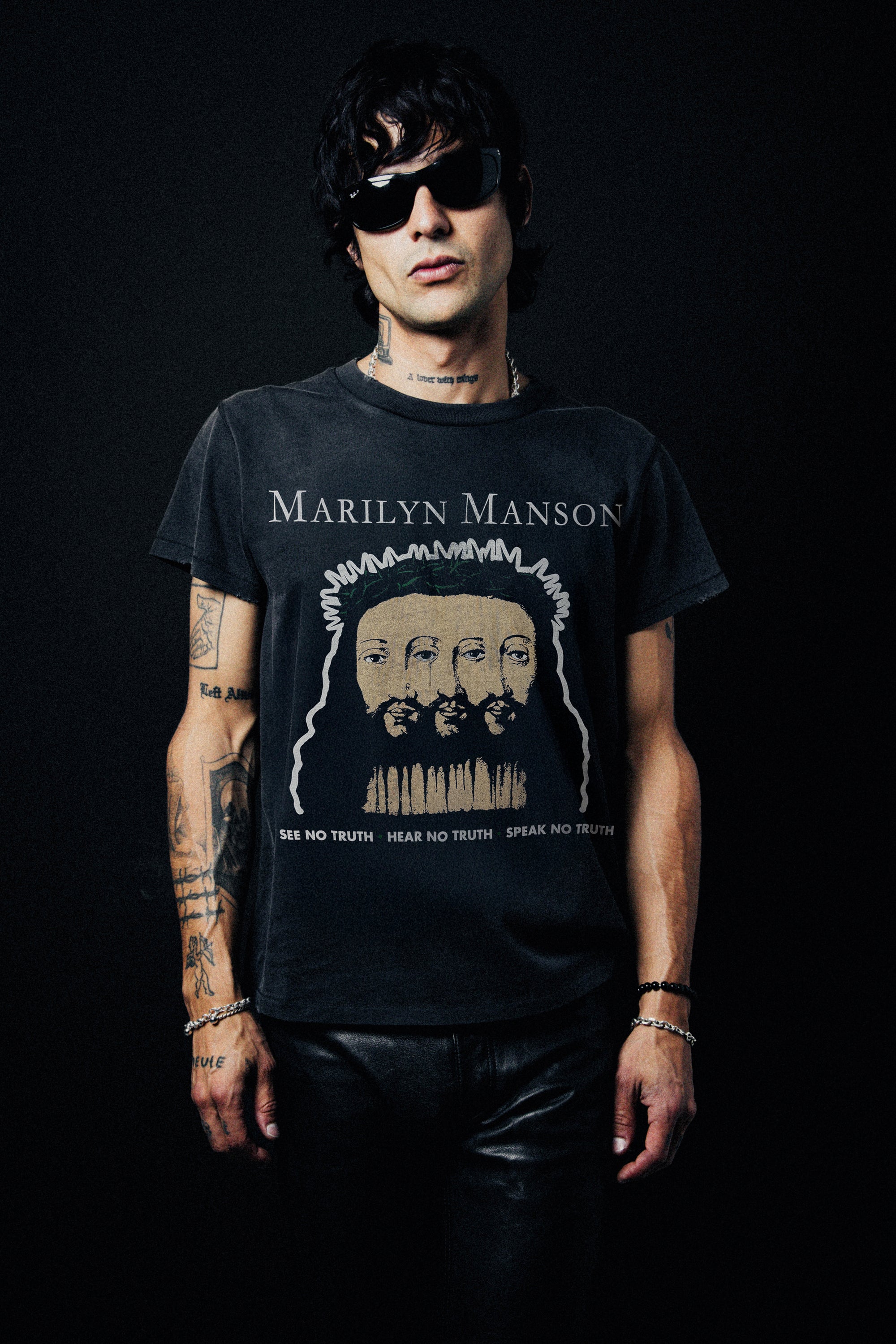 Recreated from a rare 90s original, this reissued Marilyn Manson tee captures the dark, rebellious energy of the era. Featuring the See No Truth, Hear No Truth, Speak No Truth graphic on the front and bold BELIEVE print on the back. Crafted from soft washed black cotton for that perfect lived-in feel and authentic vintage fade. Premium reworked band tee. Relaxed fit. Hand-screen printed in the UK.