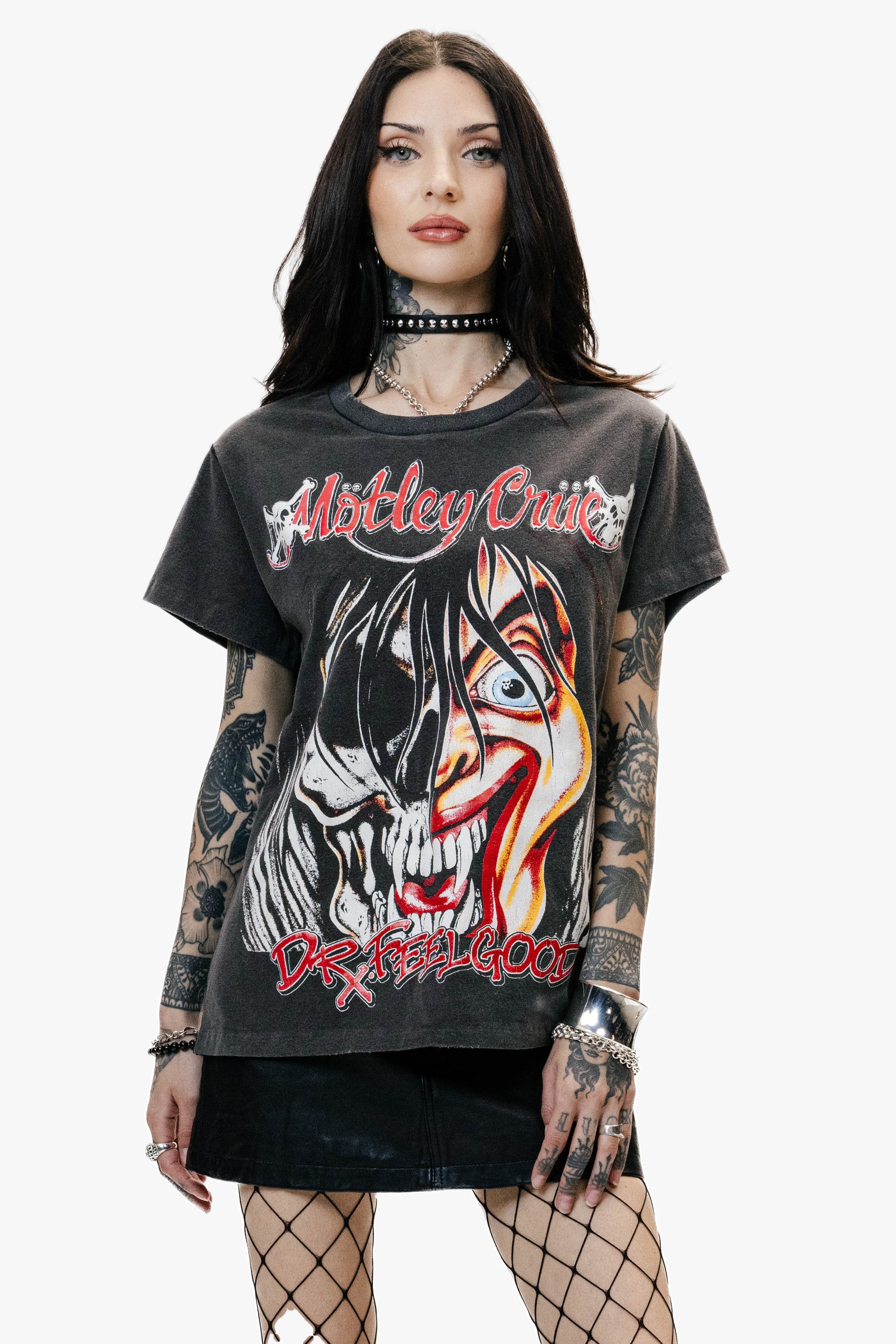 A tribute to Mötley Crüe’s Dr. Feelgood era, loud, reckless, and unapologetic. Crafted from heavyweight cotton and washed for an authentic vintage feel, it features the original Dr. Feelgood artwork on the front and the iconic quote “If you want to live life on your own terms, you gotta be willing to crash and burn” on the back. Hand-printed in the UK using cracked inks for a true relic finish.