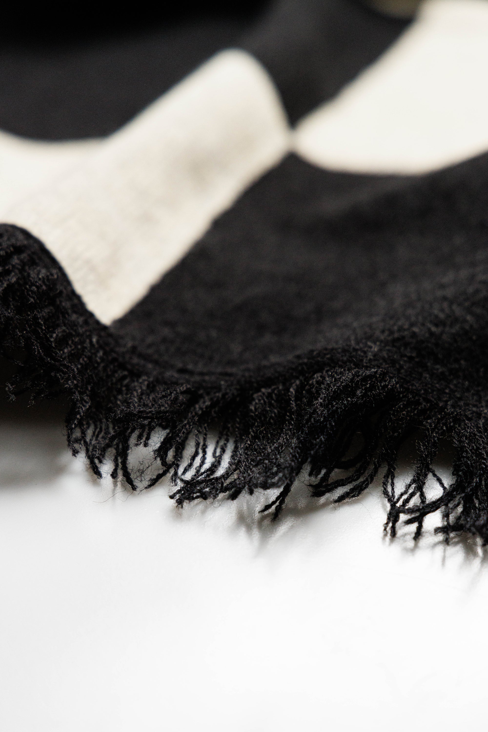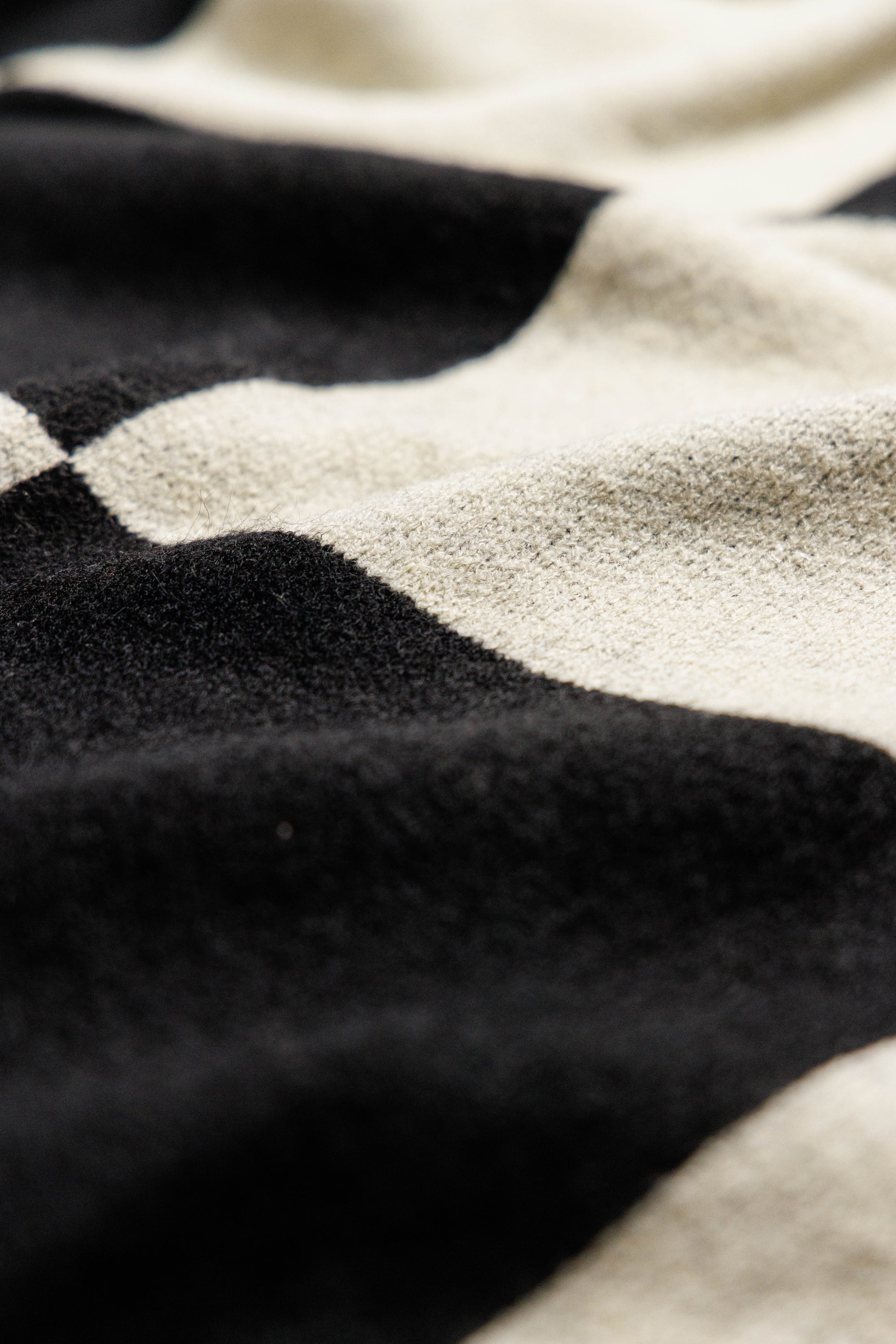 THE PONCHO RACEWAY is Our Iconic Western style Poncho featuring an all-over Raceway knit in Black & White and finished with a 4inch tonal fringe.